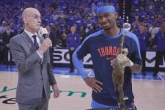 05月23日訊 西決G2,雷霆vs森林狼賽前,亞歷山大正式領(lǐng)取MVP獎(jiǎng)杯。