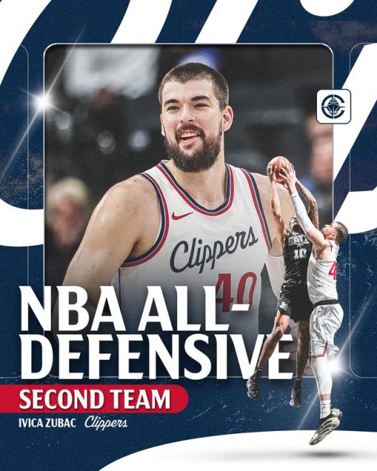 雷速體育5月23日訊 NBA官方公布了2024-25賽季最佳防守陣容,快船中鋒祖巴茨入選二防。