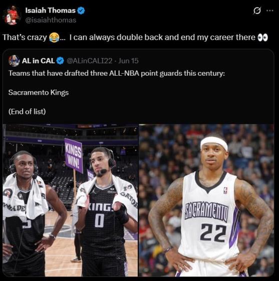 自媒體寫道:“本世紀(jì)選中三位全明星后衛(wèi)的球隊(duì)只有國(guó)王隊(duì)?!毙⊥旭R斯轉(zhuǎn)發(fā)并配文寫道:“這太瘋狂了……我可以隨時(shí)回去并在那里結(jié)束我的職業(yè)生涯。”