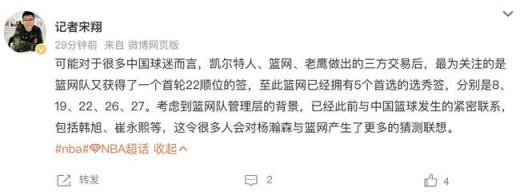 結(jié)果就在選秀大會到來之前的一天,籃網(wǎng)這邊卻傳出一個非常重磅的消息,他們通過三方交易又拿到了一個首輪簽位,對于接下來拿下楊瀚森似乎是一個重大的突破。到底是什么情況,我們來詳細(xì)分析一下。