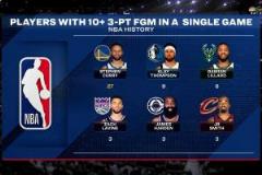 這是庫(kù)里生涯第27次單場(chǎng)命中10記三分!其余5位單場(chǎng)進(jìn)過(guò)10記三分的球員合計(jì)一攻也才24次。
