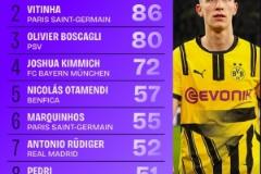 2、維蒂尼亞(巴黎圣日耳曼):86次