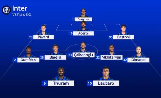 索默;帕瓦爾、阿切爾比、巴斯托·尼;鄧弗里斯、巴雷拉、恰爾汗奧盧、姆希塔良、迪馬爾科;馬庫(kù)斯-圖拉姆、勞塔羅