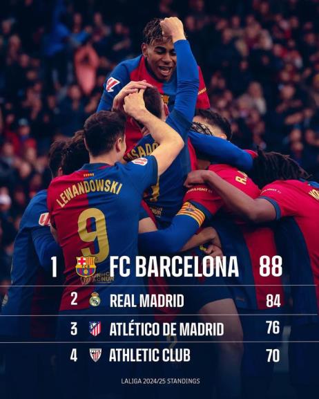 2024/25賽季西甲收官,巴薩最終以88分奪冠,打進102球丟了39球。