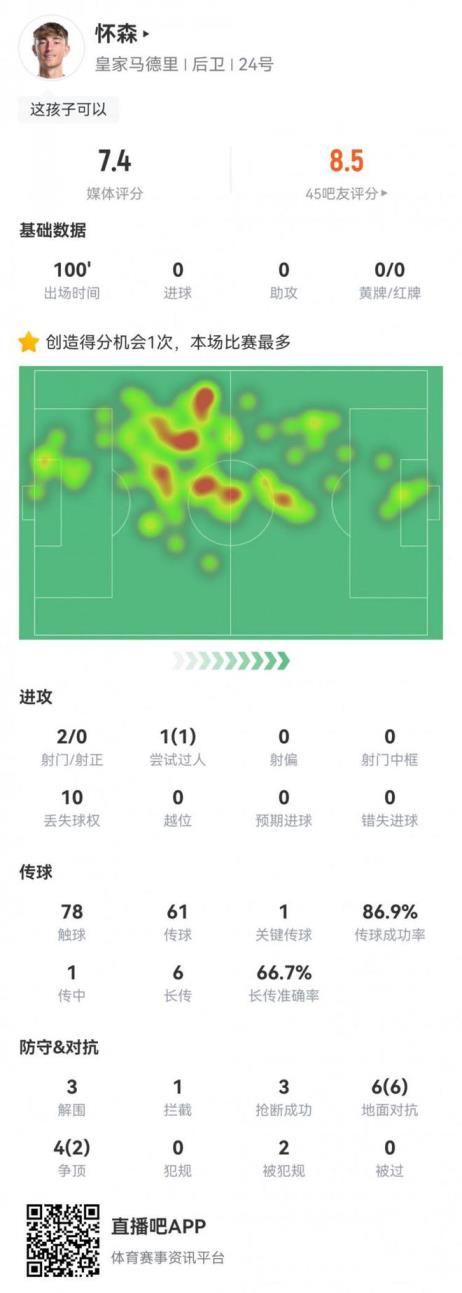 6月19日訊 新世俱杯首輪,皇馬1-1新月。此役懷森首秀首發(fā)打滿全場,球員全場重點數(shù)據(jù)如下↓