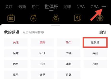 世俱杯頻道現(xiàn)已上線,點(diǎn)擊頻道欄右側(cè)【更多】按鈕展開,直達(dá)世俱杯頻道(Tips:可以點(diǎn)擊編輯根據(jù)您的喜好拖動排序),閱讀更多世俱杯專屬資訊,便捷查看世俱杯賽程、積分、球員榜及更多世俱杯專屬活動>>>