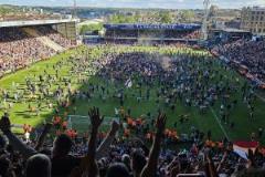 最終在第96分鐘,薩爾塞維奇將隊友拉普利斯的射門擋入球門,布拉德福德球迷再也無法抑制內(nèi)心的激動,集體沖入場內(nèi)慶祝。場內(nèi)球員無奈敦促球迷回到看臺,比賽因此暫停10分鐘,但比賽恢復后再也沒有意外發(fā)生,布拉德福德取勝,力壓沃爾索爾鎖定第三,時隔12年再度升入英甲。