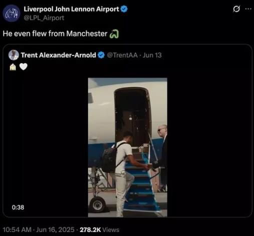 雷速體育6月17日訊 盡管離隊(duì)加盟皇馬已有半個(gè)多月,但利物浦當(dāng)?shù)貙?duì)阿諾德的負(fù)面情緒仍未消散。據(jù)《每日郵報(bào)》報(bào)道,利物浦約翰·列儂機(jī)場(chǎng)在社媒上諷刺這名加盟皇馬的前利物浦球員是叛徒。