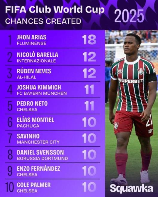 直播吧7月11日訊 本屆世俱杯僅剩巴黎vs切爾西的決賽,數(shù)據(jù)機(jī)構(gòu)squakwa也統(tǒng)計(jì)了本屆賽事創(chuàng)造機(jī)會情況,弗魯米嫩塞的27歲前鋒瓊-阿里亞斯獨(dú)自領(lǐng)跑。