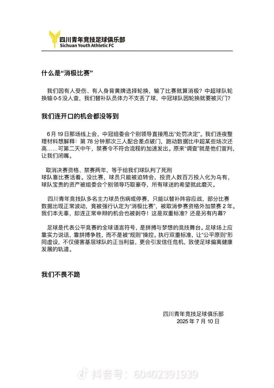 7月10日晚,被中國足協(xié)處以禁賽兩年的中冠球隊四川青年競技再次發(fā)聲,繼續(xù)強調(diào)受到了不公正待遇。